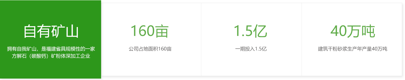 以生產(chǎn)特種干粉砂漿及重質(zhì)碳酸鈣深加工為主,近年不斷整合優(yōu)化行業(yè)供應(yīng)鏈,研發(fā)生產(chǎn)墻地面干粉砂漿與建筑飾面材料一體化材料,日益精進(jìn);目前年產(chǎn)量40萬(wàn)噸,位居福建省行業(yè)生產(chǎn)規(guī)模前列。